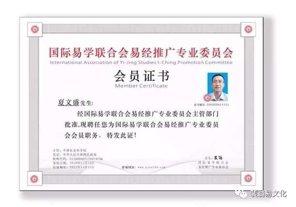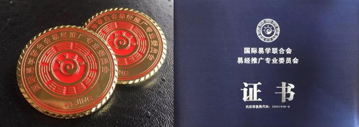 ●获得国际易学联合会易经推广专业委员会带钢印会员证书和会徽。